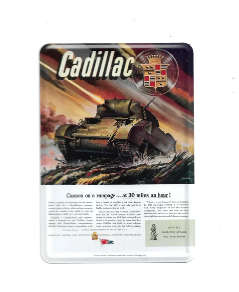Diese eindrucksvolle Blechpostkarte zeigt eine historische Cadillac-Werbeanzeige aus dem Zweiten Weltkrieg. Im Mittelpunkt steht der M-5-Panzer, der mit Cadillac-Motoren und Getrieben ausgestattet war – dargestellt in dynamischer Bewegung mit Feuerkulisse und dem Slogan „Cannon on a rampage… at 30 miles an hour!“.