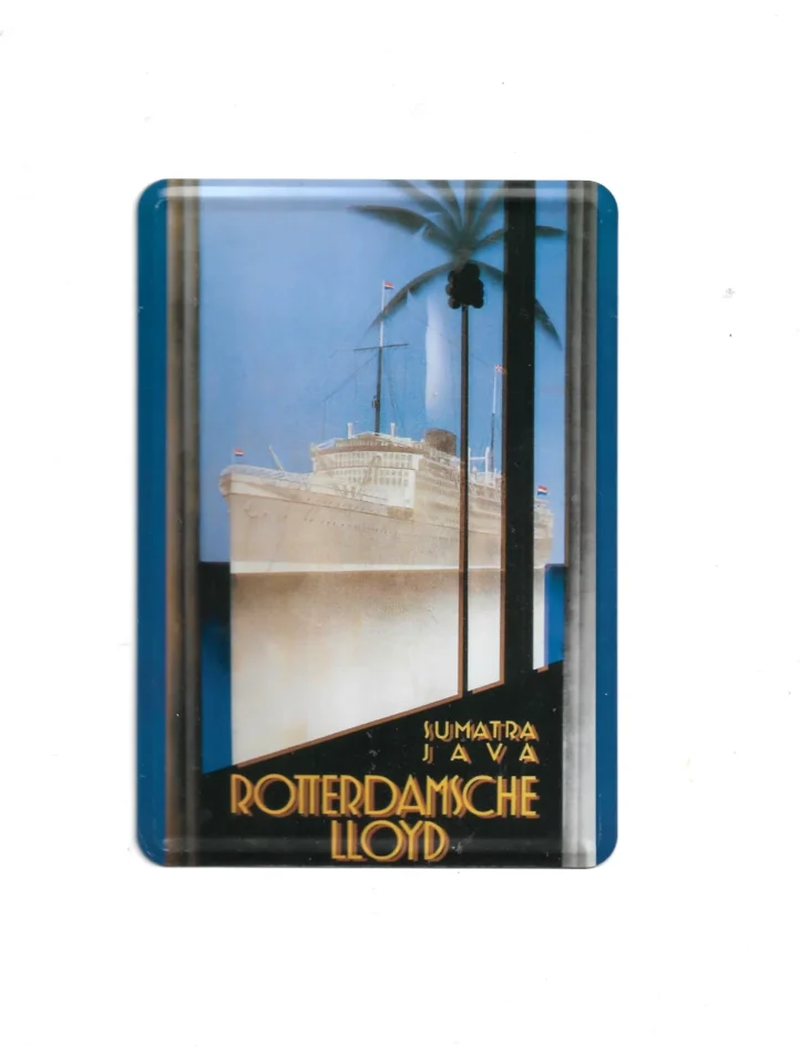 „Blechpostkarte – Rotterdamsche Lloyd: Sumatra, Java, Holland Diese nostalgische Blechpostkarte zeigt ein stilisiertes Reisedesign im Look historischer Werbeplakate: Ein imposantes Passagierschiff mit wehenden Flaggen vor tropischem Hintergrund, flankiert von Palmen und blauem Himmel. Der Schriftzug „SUMATRA – JAVA – ROTTERDAMSCHE LLOYD“ verweist auf die einst populären Reiserouten der niederländischen Reederei in die Kolonien.