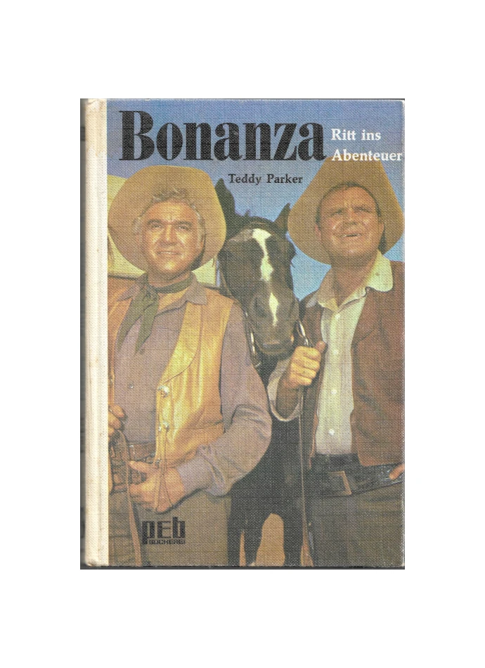 Bonanza – Ritt ins Abenteuer Autor: Teddy Parker (Pseudonym für Kurt Vethake) Illustrationen: Werner Kulle Verlag: Engelbert Verlag, Balve Erscheinungsjahr: 1969 Format: Gebundene Ausgabe, ca. 139 Seiten Reihe: PEB-Bücherei / Fernseh-Nostalgie guter gebrauchter Zustand