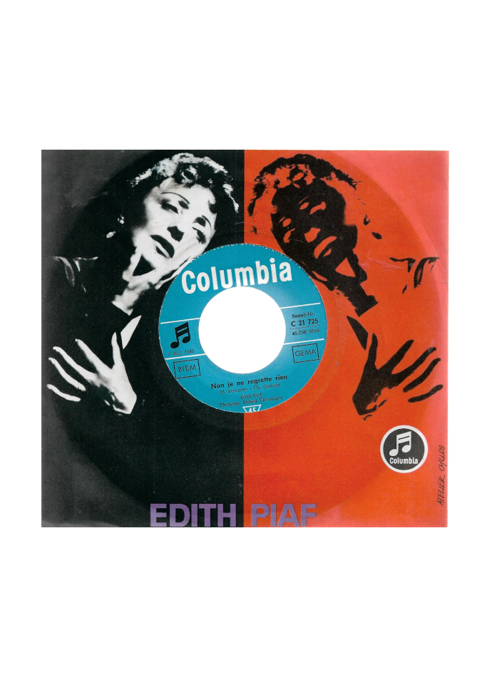 Interpretin: Edith Piaf – Titel: Non, je ne regrette rien / Jerusalem Label: Columbia Katalognummer: C 21 725 Format: 7″ Vinyl Single, 45 RPM Sprache: Französisch Orchester Robert Chauvigny Erscheinungsjahr: 1961