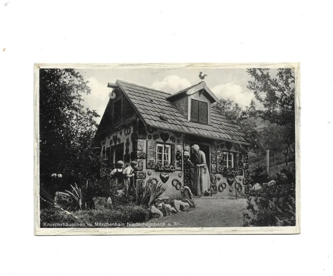Original Ansichtskarte – Märchenhain Niederheimbach am Rhein Verlag und Photo: L. Manowitsch, Niederheimbach/Rh. Format: Standard-Postkarte, 14 x 9 cm, schwarz-weiß bedruckt Motiv: Märchenszene – Hänsel und Gretel, Zustand: Gebraucht, altersgemäß gut erhalten (leichte Gebrauchsspuren vorhanden, siehe Scan) auf die Rückseite(leicht fleckig) ist etwas größer die Zahl 1 geschrieben.