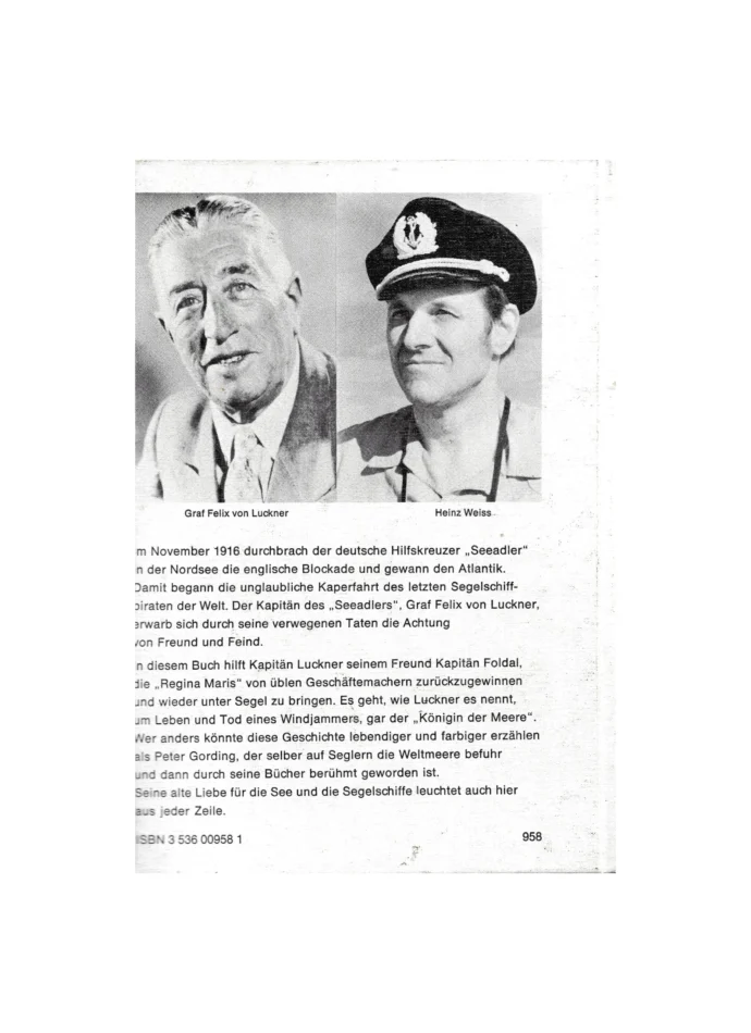 Ein packender Jugendroman über den legendären Seefahrer Felix Graf von Luckner, der im Ersten Weltkrieg als „Seeteufel“ berühmt wurde – nicht durch Brutalität, sondern durch Mut, List und Menschlichkeit. Peter Gording erzählt in lebendiger Sprache von einer fiktiven Rückkehr des Grafen auf die Weltmeere, wo er erneut auf Kaperfahrt geht – diesmal mit jungen Begleitern, einem geheimen Auftrag und dem Geist alter Abenteuer. Das Buch verbindet historische Fakten mit spannender Erzählung, ideal für junge Leser, die sich für Seefahrt, Geschichte und Heldenfiguren interessieren. Ein typisches Engelbert-Buch der 1970er Jahre – mit klarer Sprache, maritimer Atmosphäre und einem Hauch von Nostalgie