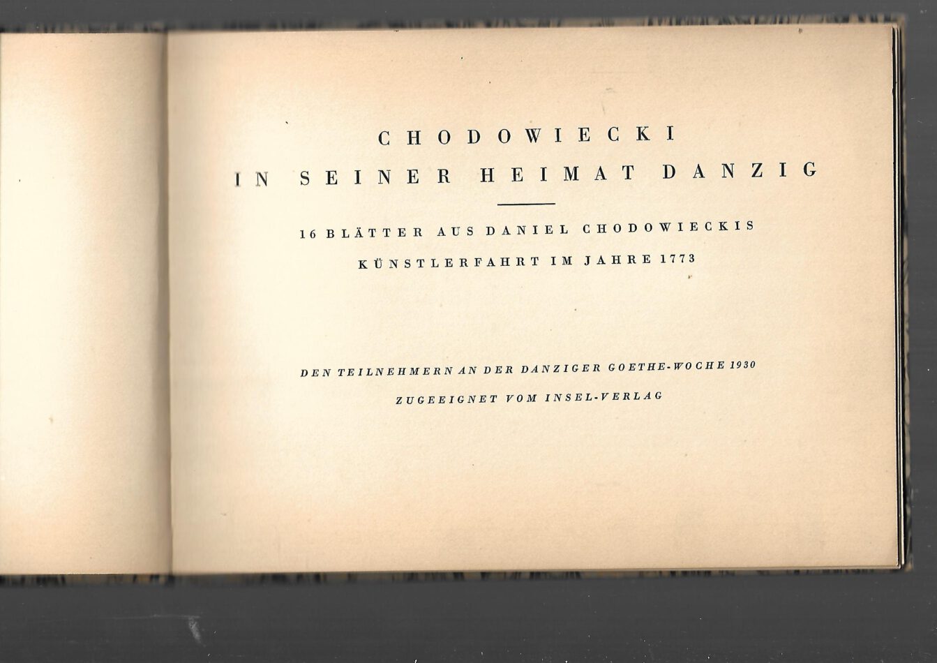 Malerei Chodowiecki in seiner Heimat Danzig 1773 – 16 Blätter aus seiner Künstlerfahrt im Jahre 1773 erschien limitiert in 500 Exemplaren Insel Verlag 1930 guter Zustand marmoriert Pappeinband etwas verzogen erschien limitiert in 500 Exemplaren den Teilnehmern an der Danziger Goethe-Woche 1930 zugeeignet