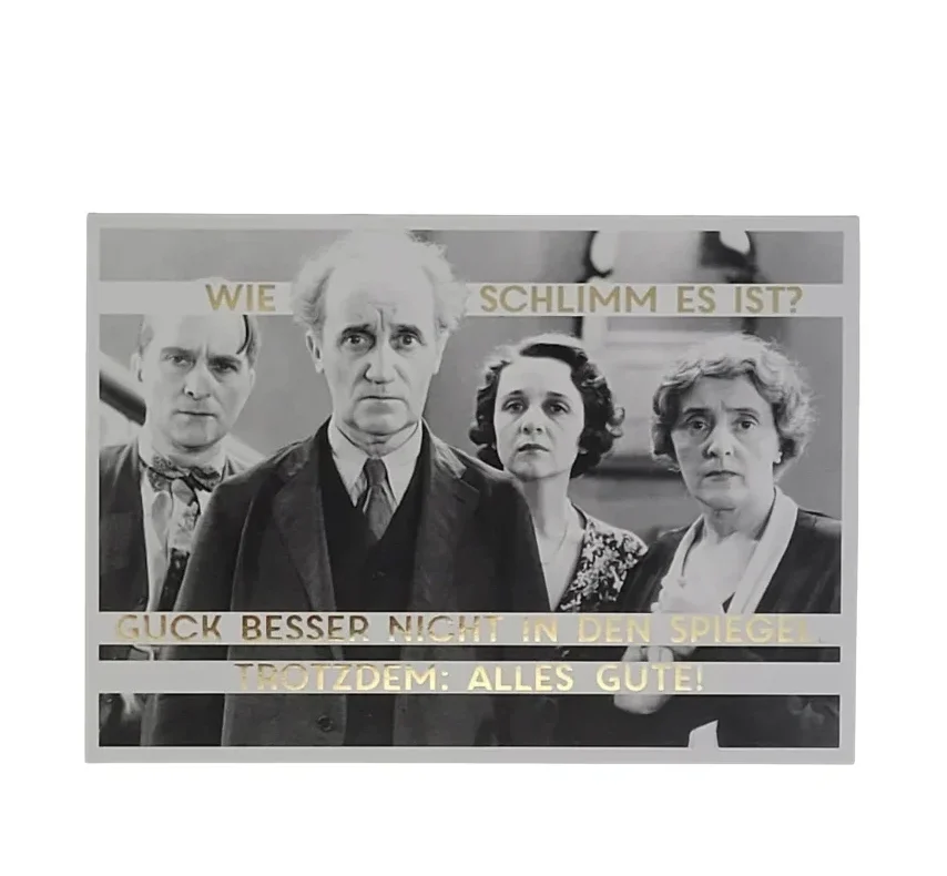 Das Schwarz-Weiß-Foto zeigt vier ältere Personen mit ernsten Blicken, die wie eine Jury (sehen sie nicht herrlich aus) über das in die Jahre gekommene Geburtstagskind befinden. Der goldene Spruch „WIE SCHLIMM ES IST? GUCK BESSER NICHT IN DEN SPIEGEL. TROTZDEM: ALLES GUTE!“ ist ein schöner frecher Geburtstagsgruß