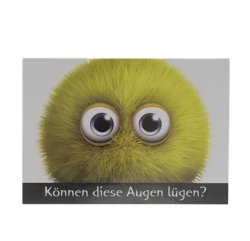 „Postkarte mit einem runden, flauschigen Wesen mit großen, treu blickenden Augen. Darunter der Spruch: ‚Können diese Augen lügen?‘ – ein humorvoller und herzerwärmender Blickfänger.“