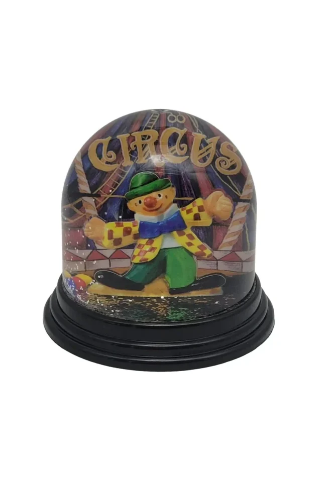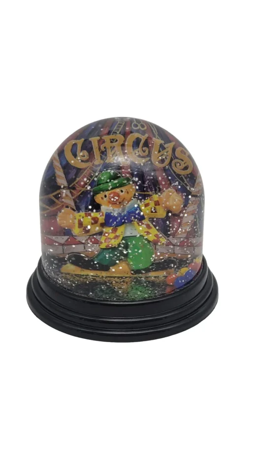 „Rondo Schneekugel „Zirkus-Clown mit bunten Bällen“ – nostalgisch und farbenfroh Diese dekorative Schneekugel zeigt einen fröhlichen Clown in klassischem Zirkus-Outfit: grüner Hut, gelb-rot karierte Jacke, grüne Hose und blaue Fliege. Im Hintergrund leuchtet ein stilisiertes Zirkuszelt mit dem Schriftzug „CIRCUS“. Beim Schütteln wirbeln feine Glitzerpartikel durch die Kugel und erzeugen eine verspielte Schneewirkung.