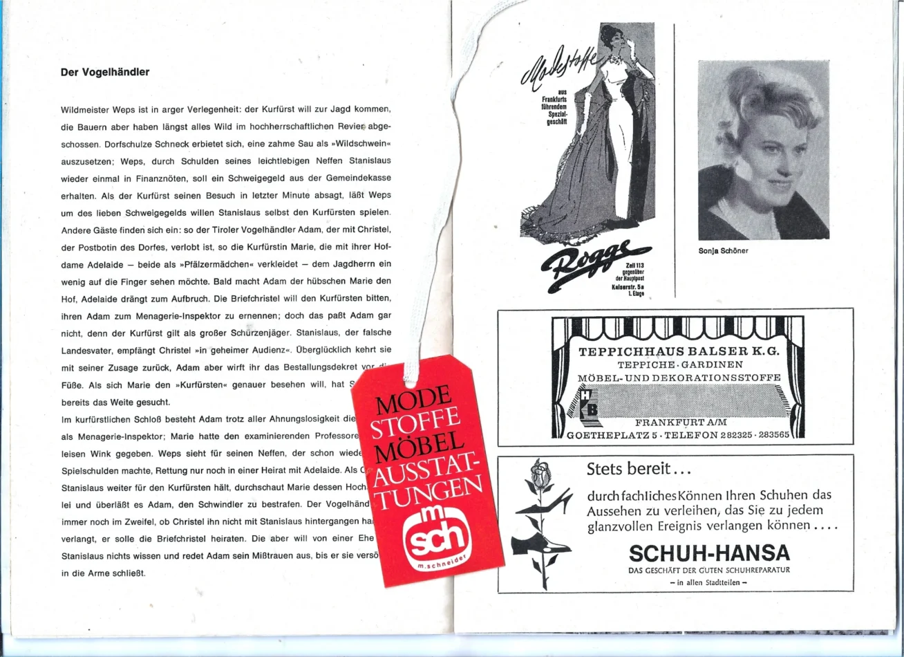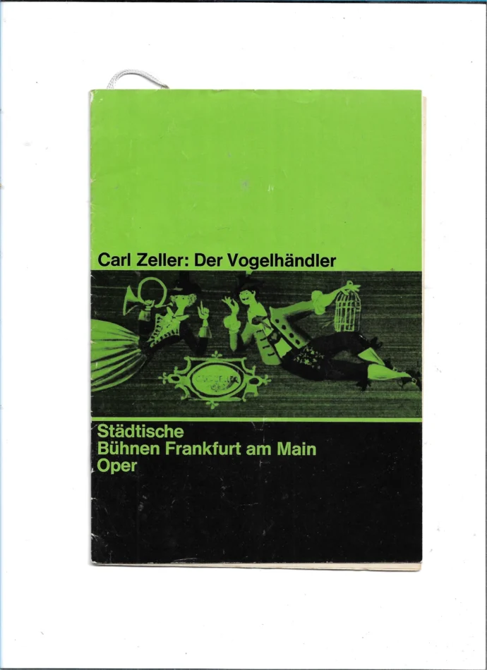 Dieses originale Programmheft von 1967 dokumentiert eine Aufführung der beliebten Operette „Der Vogelhändler“ von Carl Zeller an den Städtischen Bühnen Frankfurt am Main. Besonders hervorzuheben sind die Mitwirkenden: der gefeierte Tenor Hermann Winkler als Graf Stanislaus und die charmante Sopranistin Sonja Schöner als Briefchristel. Die musikalische Leitung hatte Wolfgang Rennert, Regie führte Werner Düggelin.