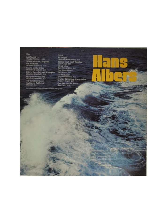 Hans Albers – La Paloma / Nimm mich mit, Kapitän Label: AMIGA 851265 / VEB Deutsche Schallplatten Berlin DDR Übernahme von Teldec BRD: Erscheinungsjahr 1988 Format: Vinyl-LP Zustand: Guter Zustand, Cover mit leichten Gebrauchsspuren
