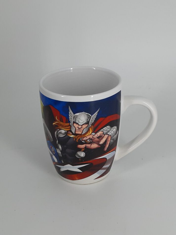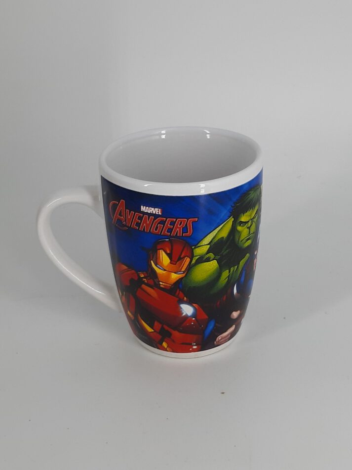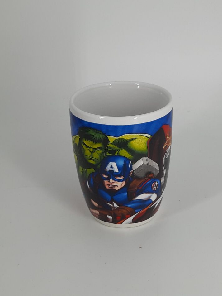 „Lustige Tasse für Kinder robuster Keramik. Die Tasse (310 ml) hat ein rundumlaufendes „AVENGERS“-Motiv. Sie ist sehr standsicher. Die Tassen sind spülmaschinen- und mikrowellengeeignet. (Ø 8 cm x 9,5 cm) Gewicht: 340 gr.